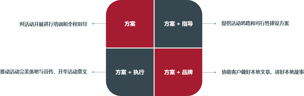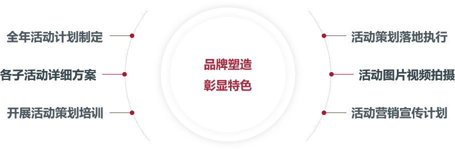 秉承“品牌塑造·彰显特色”的服务理念,根据客户业务宣传特色和特点,立足客户所在是省、市宣传工作重点和要点,同时结合本地的地域文化和发展现状量身定制活动方案并可以辅助落地实施,并提供从前期预热宣传到落地举办及摄影摄像一体化服务,可根据客户需求提供单一式或组合式的服务内容。